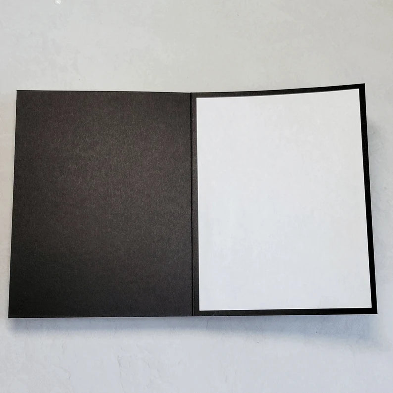 Inside of cards are left blank to provide room for you to write your personalized messages. White inserts are included with all colored or black card bases. Stamped sentiments can be requested upon checkout.